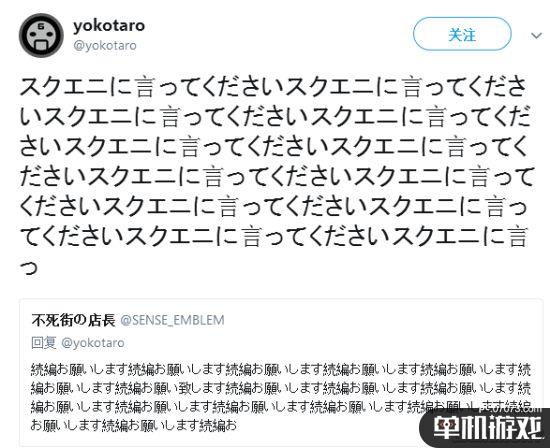 一名玩家在推上給橫尾太郎留言“請(qǐng)出續(xù)篇xN”,面對(duì)該名玩家的請(qǐng)求,yokotaro回復(fù)道:“跟SE說(shuō)去xN”。