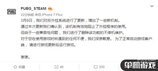 今日,PUBG_STEAM在官方微博宣布,3月9日更新的反外掛系統(tǒng)中的新機(jī)制很有效,但由于兼容性問題,又將該功能刪除了。
