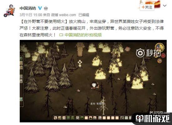繼之前北京消防用《塞爾達傳說:荒野之息》宣傳防火知識,“批評”林克野外用明火,今天公安部消防局官方微博@中國消防 也在微博上“嚴(yán)厲批評”了《饑荒》中放火燒山的行為,表示:放火燒山,牢底坐穿,異世界某薇姓女子將受到法律嚴(yán)懲!