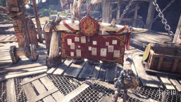 在據(jù)點(diǎn)入口附近可以看到任務(wù)留言板(クエストボード)以及道具箱。獵人們可以自由前往各個(gè)狩獵場(chǎng)探索,或者是承接各種任務(wù)調(diào)查新大陸。