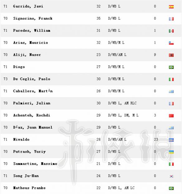 R列表為總評(píng),81+為世界級(jí),78-80是頂級(jí)聯(lián)賽中最好的球員,75-77頂級(jí)聯(lián)賽中堅(jiān)實(shí)的后盾,72-74冠軍球隊(duì)球員,69-71實(shí)用聯(lián)賽球員。