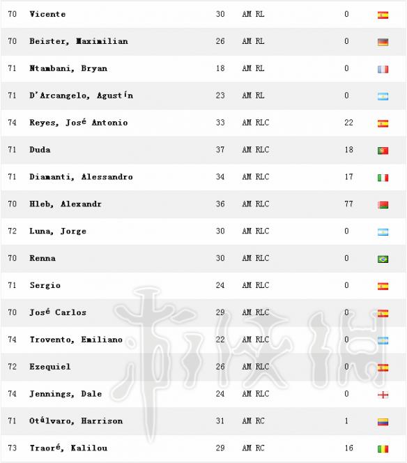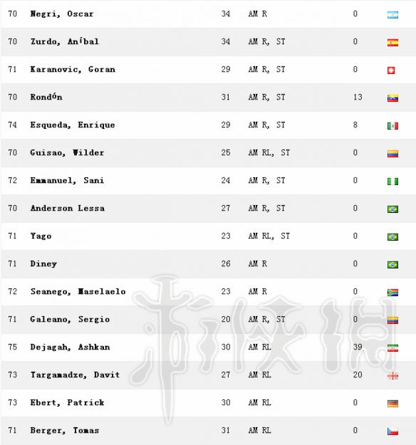 R列表為總評,81+為世界級,78-80是頂級聯(lián)賽中最好的球員,75-77頂級聯(lián)賽中堅(jiān)實(shí)的后盾,72-74冠軍球隊(duì)球員,69-71實(shí)用聯(lián)賽球員。