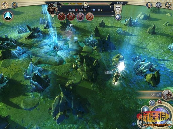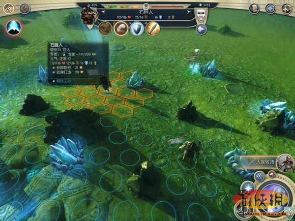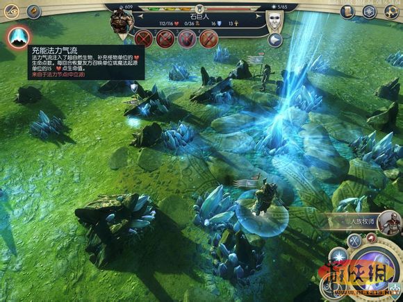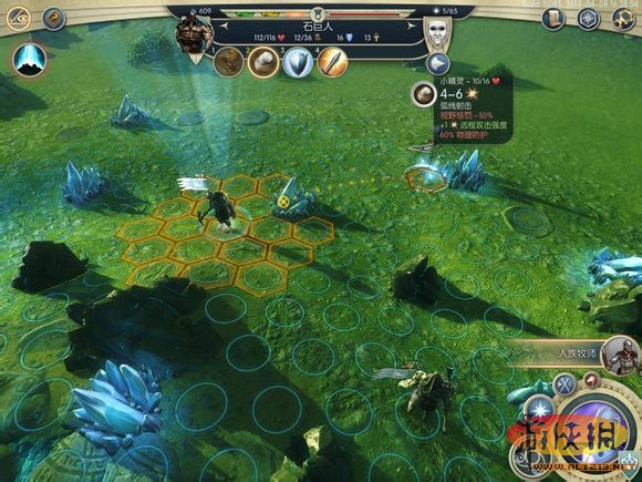 招了2個(gè)野生石巨人(4級(jí)兵,移動(dòng)36,有遠(yuǎn)程扔石頭技能),就開始變著方玩了。首先來到由2個(gè)小精靈駐守的魔法資源點(diǎn),戰(zhàn)場(chǎng)擁有充能法力氣流,每回合回復(fù)召喚單位的HP。