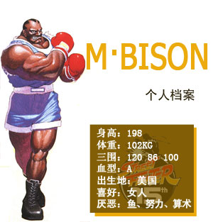 希望得到金錢(qián)的BISON,被拳擊界驅(qū)逐后便投靠了VEGA,無(wú)論是格斗家、士兵、還是警衛(wèi)??傊艿玫藉X(qián)的話,不管VEGA讓他做什么他都愿意。是個(gè)為了成為億萬(wàn)富翁和擁有世界第一的稱(chēng)號(hào)而奮斗的斗士。