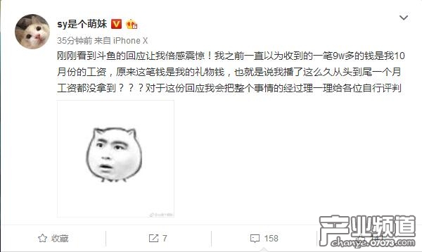 而隨后,主播sy是個萌妹也做出了說明,他再懟斗魚道:剛剛看到斗魚的回應(yīng)讓我倍感震驚!我之前一直以為收到的一筆9w多的錢是我10月份的工資,原來這筆錢是我的禮物錢,也就是說我播了這么久從頭到尾一個月工資都沒拿到?對于這份回應(yīng)我會把整個事情的經(jīng)過理一理給各位自行評判。