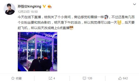 當天比賽現(xiàn)場的粉絲還是十分熱情的,唯一讓猴哥郁悶的就是現(xiàn)場這跟玻璃房一樣的比賽房間了,猴哥自己也是在微博吐槽,覺得旁邊人看他就跟看猴子一樣。他這句調(diào)侃也引來了自己的共鳴,紛紛在微博上調(diào)侃可以投幣抓猴了。