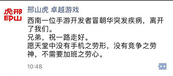 作為游戲界的元老級人物,冒朝華逝世的消息傳出之后,在圈內(nèi)引起不小的轟動,多家游戲公司高管在社交媒體平臺表達(dá)哀悼,其中卓越游戲CEO邢山虎就在微信朋友圈悼念道:“愿天堂沒有競爭之勞神,不需要加班之勞心。”