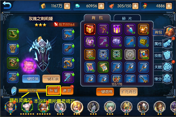 在這里要注意啦!升星按鈕旁邊就是升星所需的靈魂石個(gè)數(shù)以及你當(dāng)前所擁有靈魂石的個(gè)數(shù)。滿足條件才可以升星。