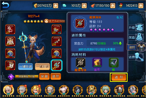 你終于看到進(jìn)階那個(gè)按鈕了吧?如果你有我前面說過的足夠的資源,金幣!鐵!還有一模一樣的裝備,那么別猶豫!點(diǎn)下去!