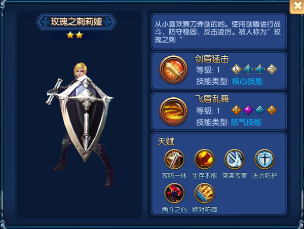 既然玫瑰之刺莉婭是一個(gè)防御型戰(zhàn)士,那么肯定在培養(yǎng)時(shí)對(duì)于生命,防御,格擋等防御型屬性的投入,價(jià)值會(huì)更高一些,首先我們來(lái)看看她的技能