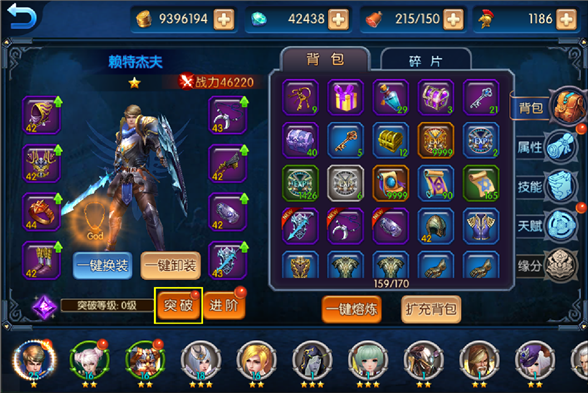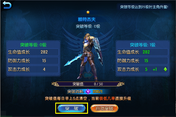 點(diǎn)一下突破,你會發(fā)現(xiàn)你的突破值+10了,當(dāng)然,如果你是幸運(yùn)女神的私生子,應(yīng)該直接突破等級+1了吧?哈哈哈