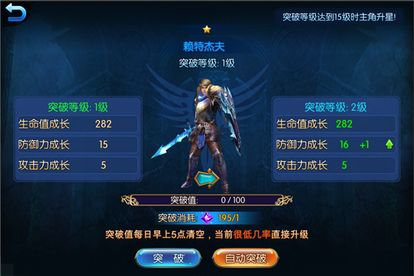 自動突破:省去你不停的點(diǎn)點(diǎn)點(diǎn),只要突破石足夠,就一直自動進(jìn)行突破,直到突破等級+1