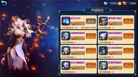 聲望可以購買到大量稀有的英雄靈魂石,方便你提升自己的實力。并且還可以在這里兌換到游戲最值錢的貨幣-鉆石。