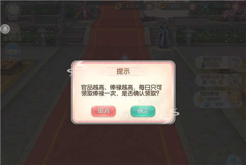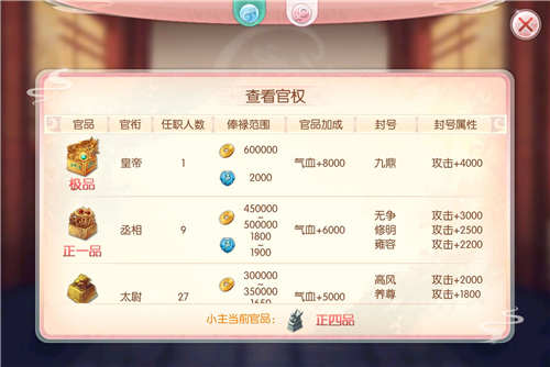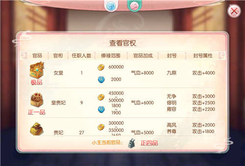 當(dāng)然,隨著官品的晉升,官品的特權(quán)也會(huì)越來(lái)越大,從掌嘴、請(qǐng)安、鞭笞到后面的請(qǐng)安、拜訪等宮斗權(quán)利。不僅如此,官品越高,所領(lǐng)取的俸祿和官品加成屬性亦會(huì)增加。所謂責(zé)任越大,收獲越大,成為重臣之后玩家收獲的也將越豐厚。值得注意的是,俸祿每日只能領(lǐng)取一次,可要節(jié)省著點(diǎn)花喲~