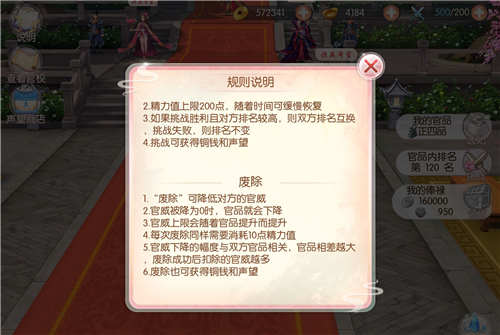 除了俸祿和特權(quán)外,官場(chǎng)還有“廢除”這項(xiàng)制度。廢除不僅可以降低對(duì)方的官威,被降為0時(shí)就會(huì)直接下降官品。雙方的官品相差越大,廢除成功后扣除的官威越多。為了保護(hù)自己也為了上位,努力向上考吧!