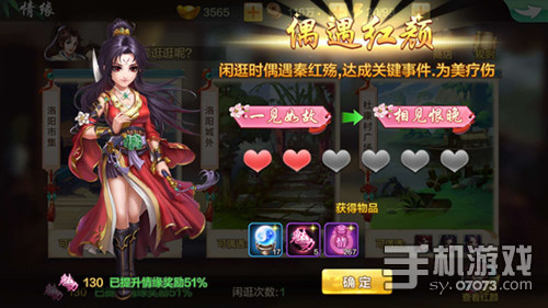 玩家可以在“俠侶情緣”系統(tǒng)中,通過(guò)閑逛來(lái)“偶遇”女性角色,以提升好感度,好感度滿(mǎn)的時(shí)候即可攻略,攻略后不同的情緣會(huì)贈(zèng)送不同的獎(jiǎng)勵(lì)哦!