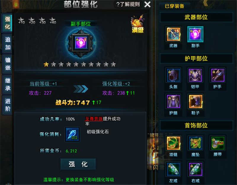 裝備強(qiáng)化系統(tǒng),強(qiáng)化、追加、鑲嵌、繼承、進(jìn)階等項(xiàng)目。