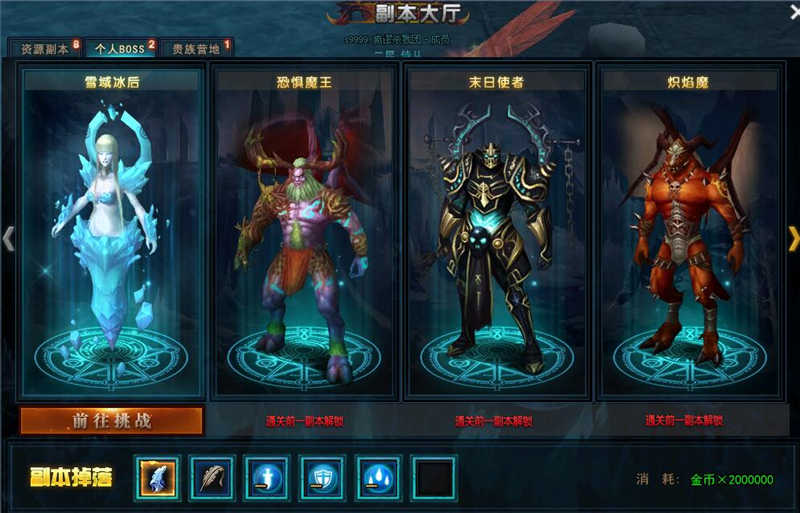 副本大廳分為資源副本、個(gè)人BOSS和貴族營(yíng)地三類。