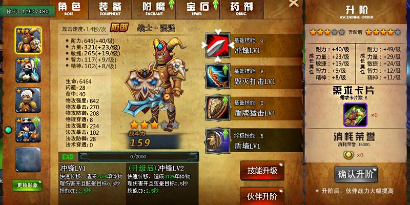 由角色、裝備、附魔、寶石、藥劑五大項構成的養(yǎng)成系統。