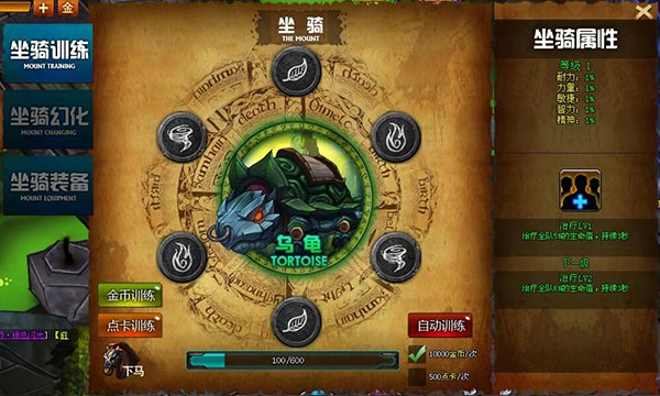 坐騎分為訓練、幻化和裝備三大游戲系統。
