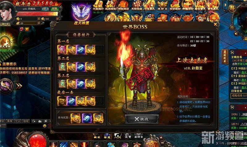 世界BOSS每天開(kāi)啟兩次,世界BOSS如果被擊殺,根據(jù)玩家造成的傷害值,給予前3名獎(jiǎng)勵(lì)。