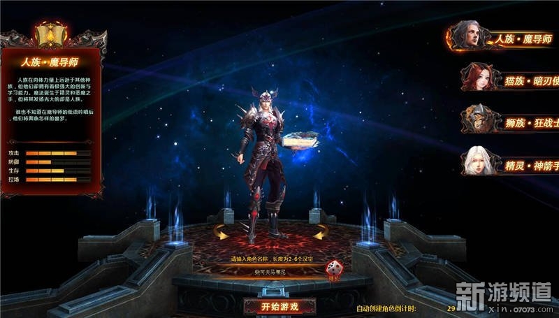目前開(kāi)放4個(gè)職業(yè):人族魔導(dǎo)師、貓族 暗刃使、獅族 狂戰(zhàn)士、精靈 神箭手。左側(cè)有角色實(shí)力介紹。