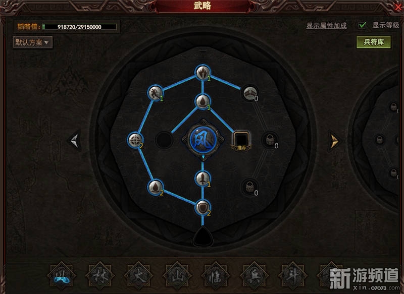 武略系統(tǒng)為角色能力成長主力途徑之一,通過消耗韜略、兵符提升角色屬性,分“風(fēng)”、“林”、“火”等八組,皆可升級。