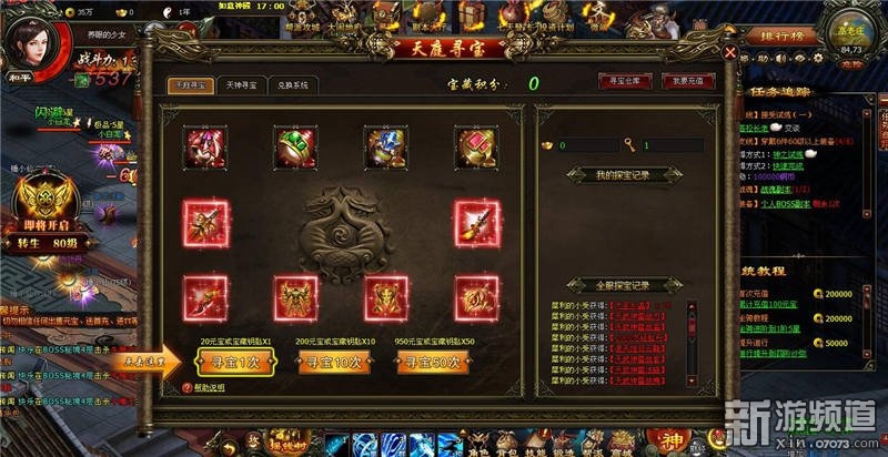 天庭尋寶有幾率獲得8轉(zhuǎn)、10轉(zhuǎn)神兵、麻痹特戒、大圣套裝;天神尋寶有幾率獲得7階、8階天神裝備以及大量經(jīng)書。