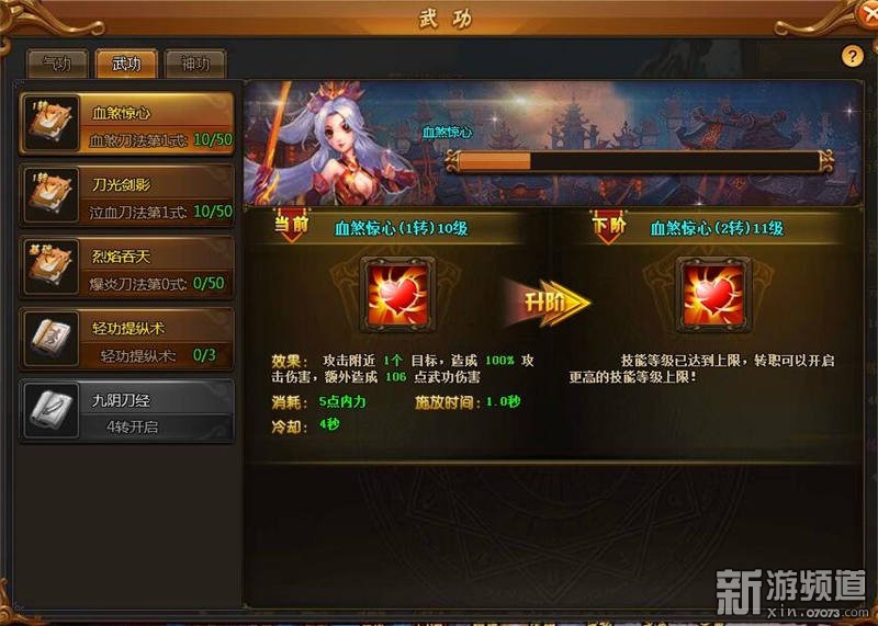 武功分為攻擊武功、氣功和神功。每式技能分為50級,達(dá)到指定等級技能會產(chǎn)生變化。
