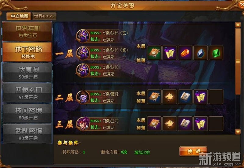 在打?qū)毜貓D的中立地圖界面,玩家每達(dá)到一個指定級別就可以開啟一章新地圖,地圖內(nèi)又分為多層挑戰(zhàn)。
