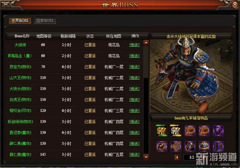 BOSS界面分為世界BOSS和國家BOSS,在這倆個BOSS世界分布著眾多BOSS,勝利后有幾率掉落珍貴物品。