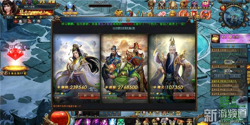 在三星祈福中可選擇銅錢,經(jīng)驗,精元進行祈福,花費元寶獲得大量資源,每日有限制次數(shù)。