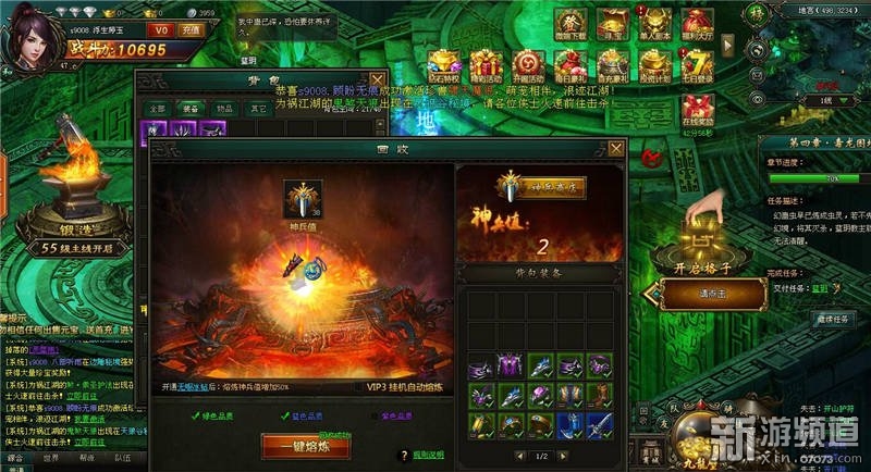 一鍵熔煉能把不需要的裝備熔煉成神兵值,方便快捷,用神兵值可以購買商店的游戲道具。
