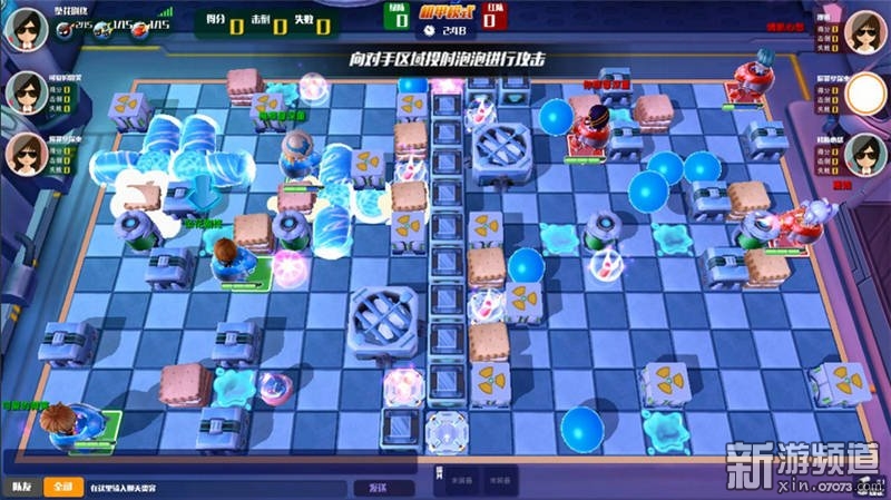 機甲模式里角色乘坐機甲向?qū)κ謪^(qū)域投射泡泡攻擊對手,在3分鐘內(nèi),摧毀全部對手的機甲獲勝。