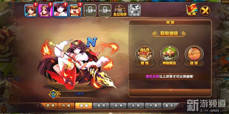 武將可以通過(guò)升級(jí)、突破、培養(yǎng)、天命、寶石等多種養(yǎng)成方式來(lái)提高能力??梢酝ㄟ^(guò)武將搭配激活武將緣分,提高武將戰(zhàn)力。