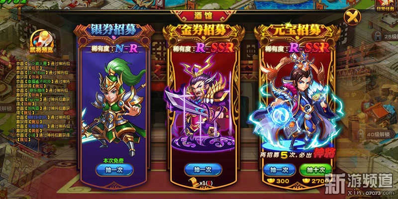 酒館系統(tǒng)中提供普通、高級(jí)招募方式,玩家通過(guò)招募令、銅錢、元寶等道具抽取武將。每天都有免費(fèi)抽取機(jī)會(huì)送給玩家。