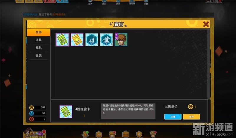 別忘了查看你的背包,這里面裝了很多有價值的物品,如獎勵給你的限時球員,以及徽記卡和經(jīng)驗卡。