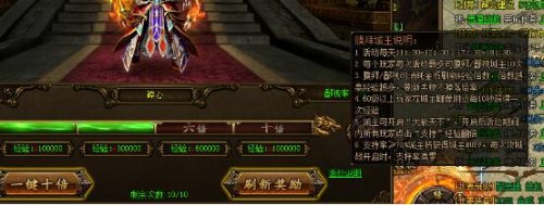 已經(jīng)刷新到一半了,我們不妨再仔細閱讀下膜拜城主說明,看看里面還有什么關鍵詞。關于膜拜時間,小編還真說錯了,每天可以膜拜兩次,每次1小時。單個玩家每次活動最多可以膜拜城主10次,這個就是極限了。金幣刷新倍率,如果刷新10次,每次10倍,那么就可以收獲到1000萬的經(jīng)驗值,每日兩次2000萬。60級以上的傲天攻沙小伙伴,在城主雕像附近還可以每10秒收獲一次經(jīng)驗,同樣是每日兩次,每次750萬,這里又可以收集到1500萬的獎勵。