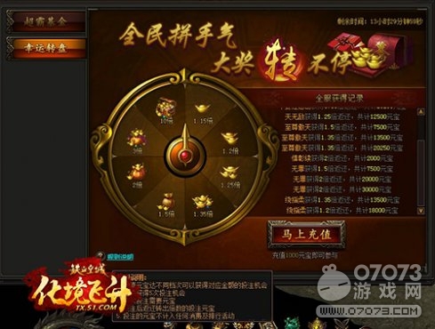 開啟新服幸運(yùn)轉(zhuǎn)盤,“大尺度”回饋玩家。新服玩家充值元寶達(dá)到不同檔次可獲得對應(yīng)金額的投注機(jī)會,每人最多獲得5次投注機(jī)會,每次投注需要一定數(shù)值的元寶,轉(zhuǎn)盤后會返還轉(zhuǎn)出倍數(shù)的投注元寶,投注的元寶不計(jì)入任何消費(fèi)和排行活動。此次轉(zhuǎn)盤可是穩(wěn)賺不賠的游戲玩法,最低返還115%的元寶,最高能夠得到10倍的暴擊,完全不需猶豫,暴富就在今天。