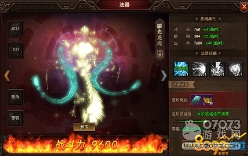 法器的進(jìn)階需要法器進(jìn)階丹,法器進(jìn)階丹可以通過(guò)擊敗野外首領(lǐng)獲得,當(dāng)然商城里也是可以直接購(gòu)買(mǎi)的,不同階的法器升階需要相對(duì)應(yīng)數(shù)量的進(jìn)階丹。不同階級(jí)的法器還能激活相對(duì)應(yīng)的法器被動(dòng)技能,被動(dòng)技能可以直接提升玩家角色的屬性,從而提升玩家的戰(zhàn)斗力。法器進(jìn)階成功后還會(huì)有一定的系統(tǒng)獎(jiǎng)勵(lì),此外法器還有自帶的法器裝備,分為肩羽、飛羽、覆角和覆羽,每一件裝備都能再高一層次的提升法器的屬性。