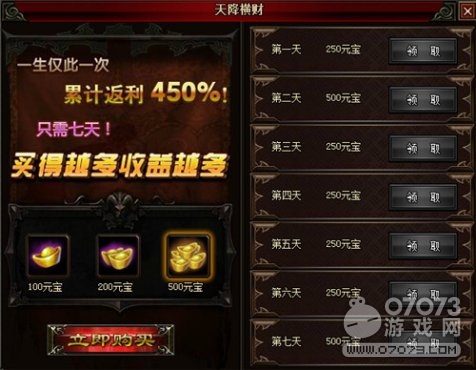 充值購買后,就可以獲得相應(yīng)的VIP服務(wù)了。然后領(lǐng)上游戲里的首充大禮包、累計(jì)充值禮包、各種返利大禮,帶上紫色武器,極品翅膀,就可以迅速超越其他小伙伴了。 如果還有閑錢的話,記得購買天降橫財(cái),450%元寶返利,絕對(duì)超值!