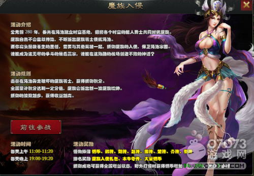 每天上午11:00-11:20以及 下午:19:00-19:20 ,擊殺在澠池奔走破壞的魔族將士,獲得抵御積分。全服累計積分達到一定分值,魔族會派出新一波魔主統(tǒng)帥。抵御的波數(shù)越多,獲得收益越高。