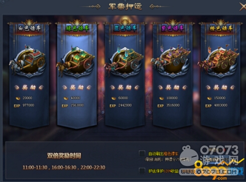 每日有三次雙倍押鏢的時間,每天11:00-11:30、16:00-16:30、22:00-22:30可以進行雙倍運鏢。鏢車分為白色鏢車、綠色鏢車、藍色鏢車、紫色鏢車、橙色鏢車,每個等級的鏢車可以獲得的經(jīng)驗不同,白色最低級橙色最高級以此類推,如果押取的鏢車不是橙色鏢車可以刷新鏢車,使用押鏢令或者50綁定元寶,刷新鏢車有失敗的幾率,可以進行多次刷新,直到滿意為止。