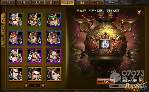 武將煉化則包括煉化、重生、分解,煉化可將武將碎片煉化為武魂,武魂可到武魂商店兌換物品;重生可使武將回到初始狀態(tài),并返還80%培養(yǎng)材料,若消耗500金幣則返還100%材料;分解技能可以獲得技能殘頁,集齊100個(gè)碎片可以合成金色品質(zhì)的技能。