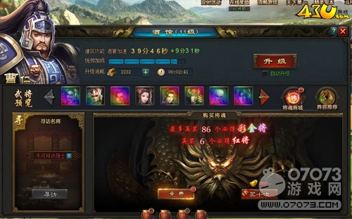 43u《烽火燎原》酒館可是武將得主要來源,為什么這么說呢?因為玩家可以通過游說和舉辦酒宴來獲得武將,沒隔一段時間玩家就可以免費舉辦一次酒宴,想要獲得更多得武將游說機會就多參與主線副本和精英副本得挑戰(zhàn)吧!