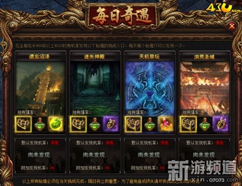 在全服擊殺900級(jí)以上的BOSS有幾率發(fā)現(xiàn)遺忘沼澤、迷失神殿、天機(jī)祭壇和洪荒圣城秘境挑戰(zhàn)入口,每天每個(gè)秘境只可以發(fā)現(xiàn)一次哦!難怪叫每日奇遇,玩家們趕快來(lái)奇遇你的秘境吧!聽(tīng)說(shuō)世界BOSS身上有幾率掉落不同級(jí)別得奇遇幸運(yùn)丹,使用后可以大幅度提升秘境的附加發(fā)現(xiàn)幾率哦!