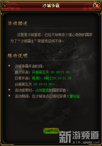 實力強大,野心自然也越大。沙城皇宮中已經(jīng)不知爆發(fā)了多少雄心勃勃的國家間的戰(zhàn)爭,為了沙城霸主的榮譽而不斷爭斗著。開服第五天的20:00-21:00 便是首次沙城爭霸時間,之后每周三、六20:00-21:00正常開啟。活動期間,玩家在沙巴克泡點區(qū)域可獲得大量經(jīng)驗?;顒咏Y(jié)束后,占領(lǐng)皇宮的國家即獲勝。
