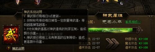 神武系統(tǒng)一共分為神武技能和神武屬性,最后一欄是告訴你傲天攻沙中如何獲取神武的。簡(jiǎn)要瀏覽下技能,攻擊神武值低于自身的玩家時(shí),傷害增加,這就是傳說(shuō)中的“神武壓制”技能。當(dāng)下小編的頭銜是無(wú)名小卒,物攻、魔攻、道攻加成都不高。至于如何獲取神武?那就必須做神武任務(wù)、進(jìn)入神武殿堂以及沙巴克的攻城戰(zhàn)??磥?lái),最后一項(xiàng)是擺明了要與沙城老大過(guò)不去。