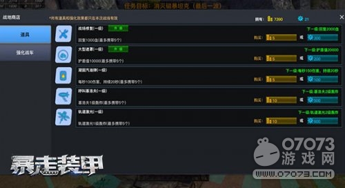 在戰(zhàn)斗中所獲得的補(bǔ)給可以用來購買道具或者強(qiáng)化戰(zhàn)車,并且這些補(bǔ)給只能在每次游戲開始后出現(xiàn)的戰(zhàn)地商店內(nèi)使用??少徺I道具有戰(zhàn)場修復(fù)、大型遮罩、凝固汽油彈、基洛夫飛艇、軌道激光等,購買之后可以自主選擇釋放,釋放后能對敵人造成巨額傷害!