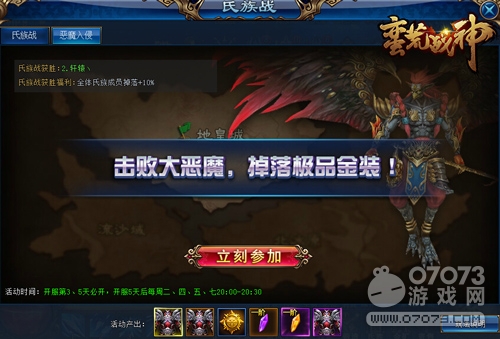 魔王蚩尤的得力手下,惡魔BOSS空降地皇主城,為了守護(hù)主城,各大氏族暫時?;?,聯(lián)手圍剿大惡魔,擊殺后各氏族將按積分發(fā)放排名獎勵,而對BOSS造成最后一擊的氏族還能獲得BOSS的掉落——極品前綴金裝,根據(jù)不同的前綴,分別擁有法攻、暴擊、物防等屬性加成,裝備價(jià)值遠(yuǎn)超普通金裝!